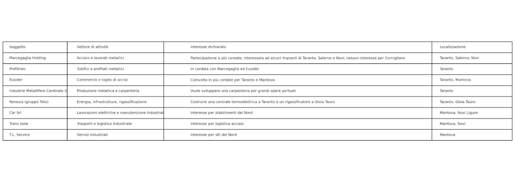 Tra i protagonisti figura Marcegaglia Holding, uno dei maggiori gruppi italiani dell’acciaio. Marcegaglia si presenta in più cordate: una con Profilmec ed Eusider, orientata su Taranto, e un’altra con Sideralba, mirata su Salerno. Il gruppo lombardo sembra interessato anche a parte del laminatoio a freddo e degli impianti di Novi Ligure, ma non ha manifestato interesse per Genova Cornigliano, che resta fuori da tutte le ipotesi di rilancio.