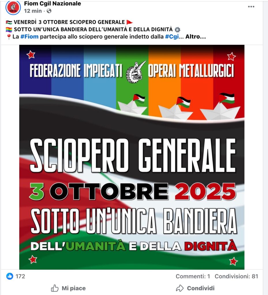 “La FIOM partecipa allo sciopero generale indetto dalla CGIL per venerdì 3 ottobre e sarà in piazza in tutte le città per sostenere la Global Sumud Flotilla e per fermare il genocidio del popolo palestinese.”