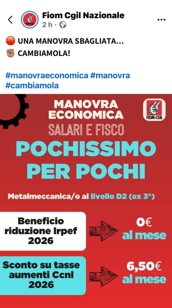 “✊ Una manovra sbagliata, cambiamola!”, scrive la Fiom, ribadendo che i lavoratori metalmeccanici non possono accontentarsi di qualche euro al mese dopo anni di stagnazione salariale.